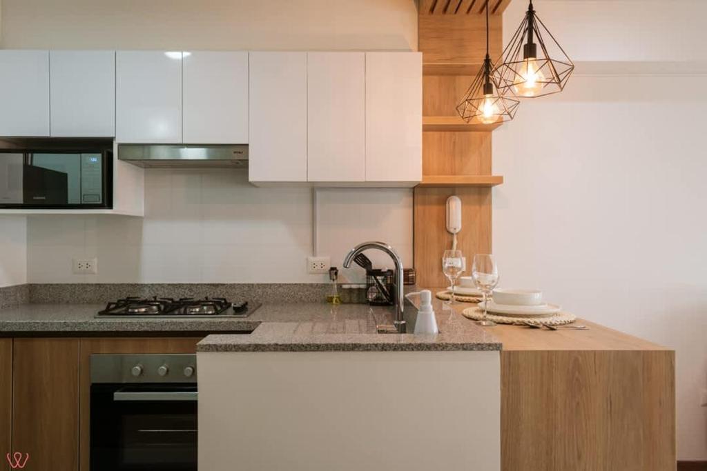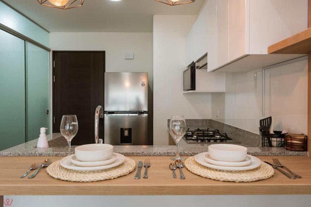 Zona de cocina, Nevera, Microondas, Hervidor eléctrico, Utensilios de cocina, Horno, Copas de vino